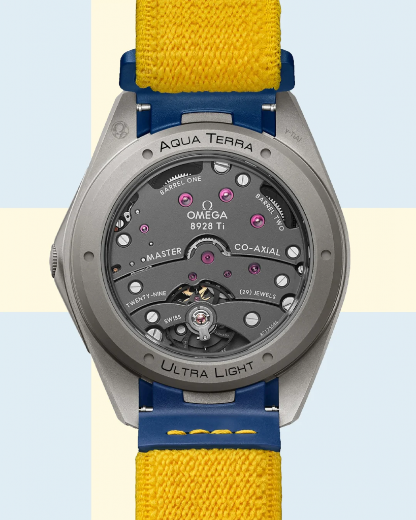 Powering the watch is the in-house hand-wound mechanical movement, caliber 8928 Ti with 29 jewels, and 25,200 Vph. This Master Chronometer-certified movement is crafted entirely from titanium, including the main plate and bridges, to maintain the watch’s ultra-lightweight profile. Power reserve can last up to 72 hours (3 days) when fully wound. the strap on this non-limited edition is yellow nylon fabric.