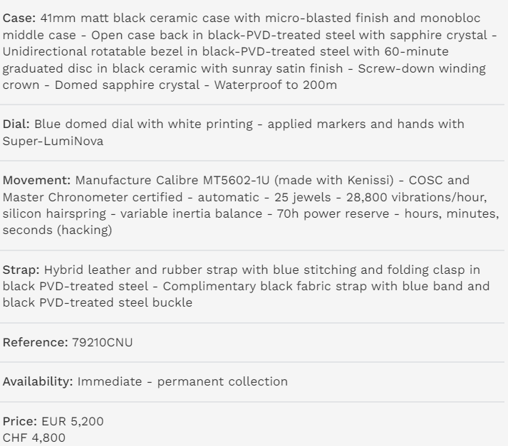 Now don’t think for one second that is why I don’t like it, (nowadays I don’t give a rat’s ass about F1. In the 1980’s my hero of the day was a moustached Brummie called Nigel Mansell) no.. the reason I don’t like it is the flat blue dial colour which is called “visa Blue” ( thank heavens it wasn’t an Anne Summers sponsorship). the rest of the watch is just standard black Bay “stuff” 41 mm black ceramic case housing the COSC calibre MT5602-1U with 15000 Gauss anti-magnetism and a 70-hour power reserve. It comes with a black rubber strap with blue stitching and a complimentary black cloth strap with a blue stripe running down the middle. The drivers were seen wearing this watch at the beginning of the season and was exclusive to the team until now.