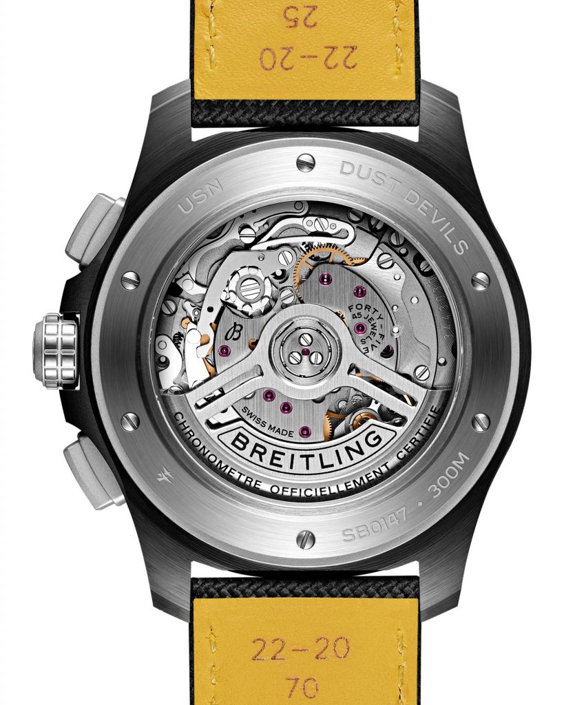 Sometime in the mid 2000’s this iconic piece was discontinued but when Georges Kern joined Breitling in 2017,one of the changes he made was to relaunch the Breitling Avenger! This new beast was now aimed at real pilots and sportspeople, with a promotional team that included astronaut Scott Kelly.fast forward to today and these editions are dedicated to the United States Naval Academy and two of the U.S. Navy’s elite air test squadrons: the Dust Devils and the Bloodhounds. Each execution features the unit’s emblem and color scheme, red and black for the Dust Devils, gray and yellow for the Bloodhounds and blue and gold for the U.S. Naval Academy.as well as a dedicated engraving surrounding the open case back view of the Breitling Manufacture Caliber 01 All three feature black ceramic cases and titanium hardware accompanied by military leather straps with contrasting top stitching.accompanied by military leather straps with contrasting top stitching.