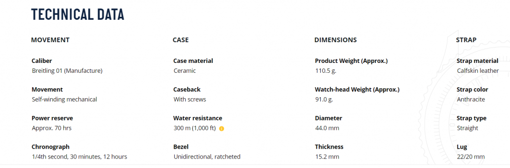I was recently gifted a Black Breitling Superocean 44 (2016 model) which as the name suggests is 44mm ( the same as these 3) on my 7.5 inch wrist it is perfect .. weight wise you are aware you have the steel “Beast” on it on but the new models will be lighter being fully ceramic . Inside each of the Breitling Avenger U.S. Naval Editions models is the brand’s in-house Caliber 01 automatic chronograph movement. The Caliber 01.This has been Breitling’s go-to in-house chronograph movement for several years and stands as an impressively capable, modern design with excellent performance across the board. Its hefty 70-hour power reserve at a 28,800 bph beat rate is supplemented by a column wheel and vertical clutch chronograph actuation system, and the movement is COSC chronometer-certified for accuracy.