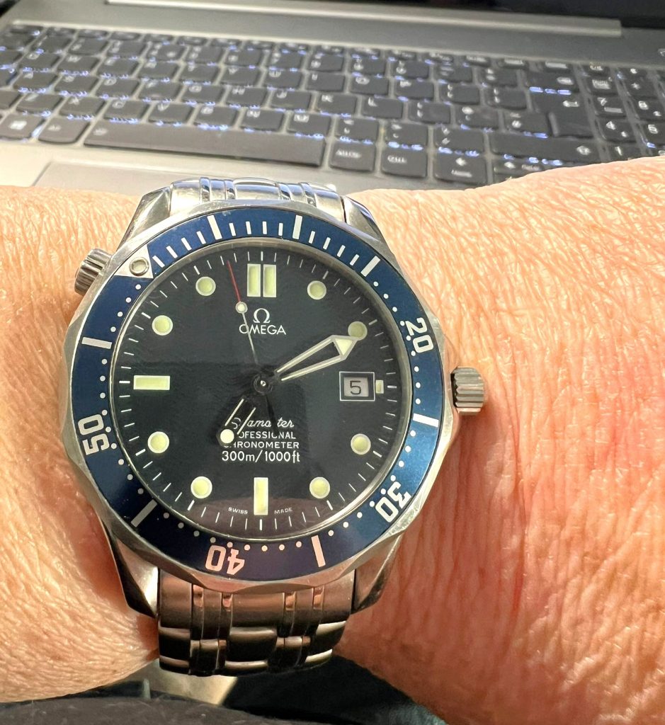 I bought my 2004 Automatic in March 2022 (and not just because it was a “Bond” watch I hasten to add) I was super cautious and aware that the old style bracelet was prone to wear and could fall to pieces so I bought a freshly serviced one for £3,345 from a reputable dealer in south Manchester. this service included the bracelet but annoyingly the faded bezel was replaced and the old one was not returned by Omega.I have been a bond fan since the 1970’s and think it was this Bond/Omega partnership that rekindled my passion for watches again. The design of the SMP is timeless, in the 2024 model the movement and bracelet may of been updated and different coloured dial options are offered but essentially the watch is the same as it always was. it could almost be a “one and done” (if that is existed in a watch collectors world). The watch is a total “strap Monster” and looks fab on rubber leather or a NATO. It works with a suit in the boardroom and is equally at home by the pool.It is Chronometer certified so keeps time with the best of em’ (- 4/+6 seconds per day) The case is 41 mm with a lug width of 20 mm the thickness is 12mm. for those undertaking a mission in the deep end of local swimming baths then you will be pleased to know the WR is 300 meters. If I have one criticism it is that the bezel is difficult to turn.